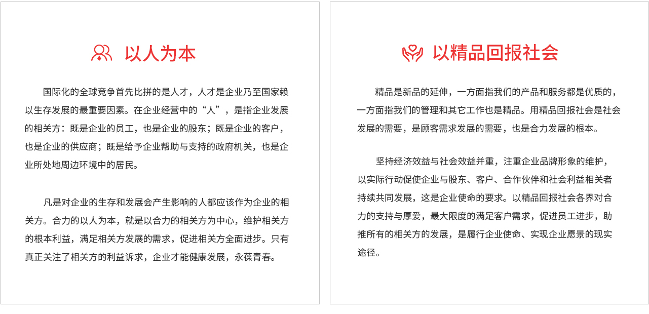 十大準則”既是合力過去50多年的成功之道,更是合力實現(xiàn)未來戰(zhàn)略,全體合力人必須大力弘揚的理念、原則和方法,必須共同遵守的行為準核心價值觀:『以人為本,以精品回報社會』